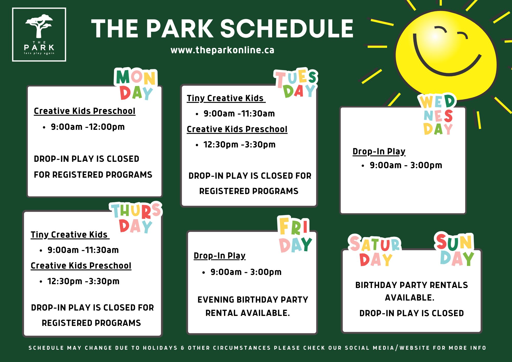 But that's not all!, on Mondays, Tuesdays and Thursdays, dive into our engaging preschool programs, and don't miss out on the excitement of our Specialized Birthday Parties, available every Thursday and Friday evening, as well as all day Saturday and Sunday! And for an adventure-packed escape, check out our beloved Creative Kids Camps, running year-round and especially during the sunny summer months.